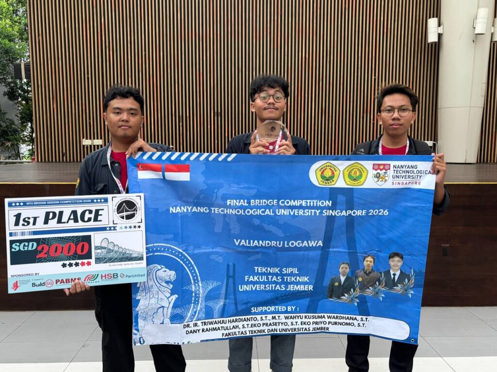 Jember, 13 April 2026 – Prestasi luar biasa kembali ditorehkan oleh mahasiswa Program Studi Teknik Sipil, Fakultas Teknik, Universitas Jember. Tim Valiandru Logawa berhasil meraih Juara 1 pada ajang NTU International Bridge Design Competition 2026, sekaligus mencatatkan empat tahun kemenangan berturut-turut (4-streak) bagi Universitas Jember dalam kompetisi internasional tersebut.